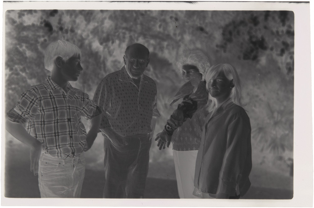 Pablo Picasso, ses enfants Claude et Paloma, et Catherine Hutin avec un perroquet sur le perron de La Californie, Cannes, en [1960]