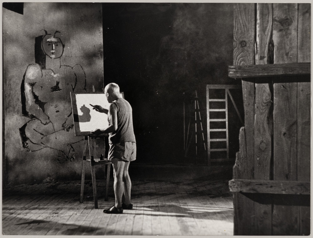 Pablo Picasso à son chevalet sur le tournage du "Mystère Picasso" de Henri-Georges Clouzot, Studio de La Victorine, Nice, en 1955