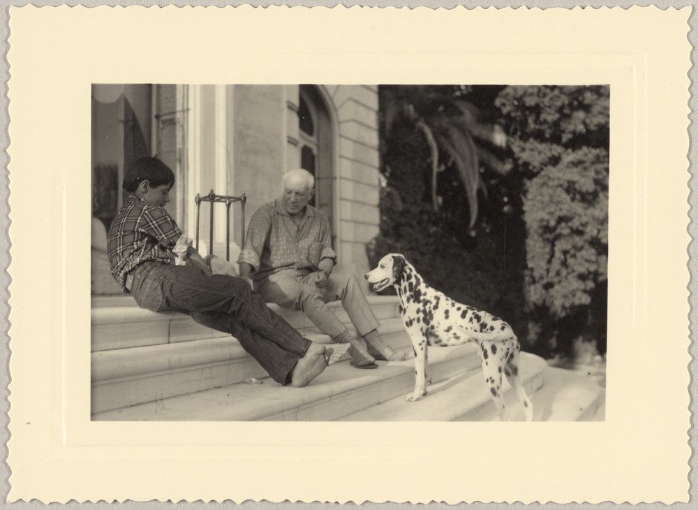 Pablo Picasso, son fils Claude avec un perroquet et le dalmatien Perro sur les marches du perron, à La Californie, Cannes, en [1960]