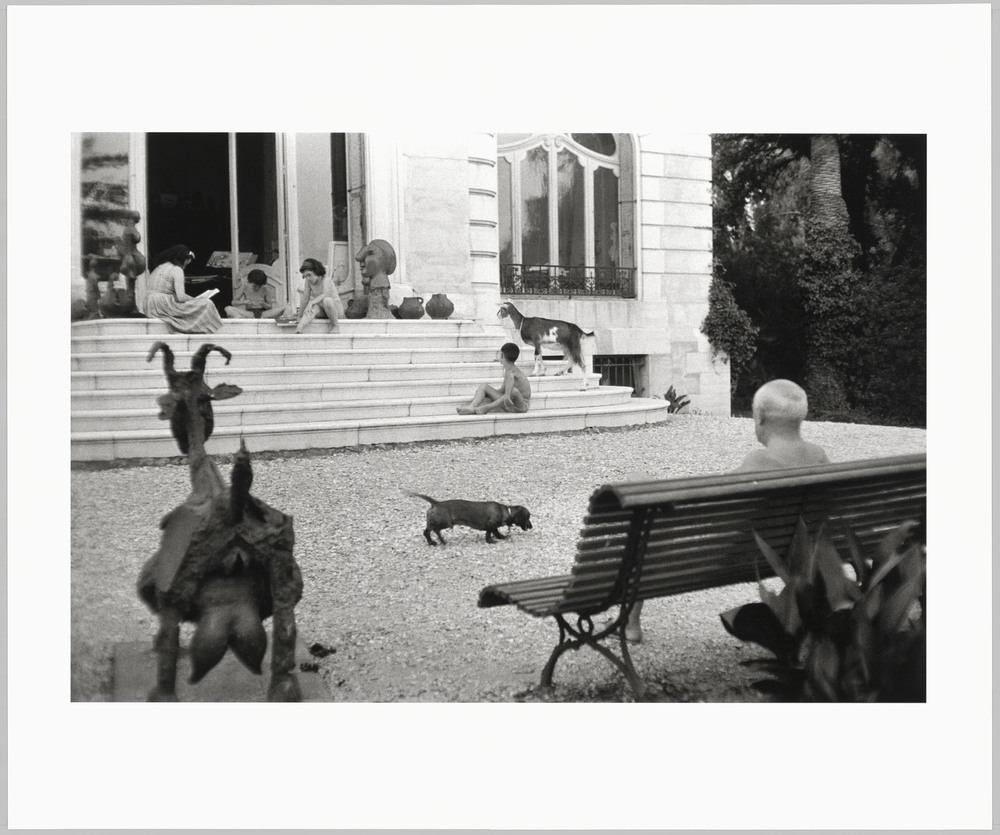 Pablo Picasso sur le banc regardant Jacqueline Roque et les enfants Claude, Paloma et Catherine Hutin assis sur les marches du perron de la Villa La Californie, Cannes, en été 1957
