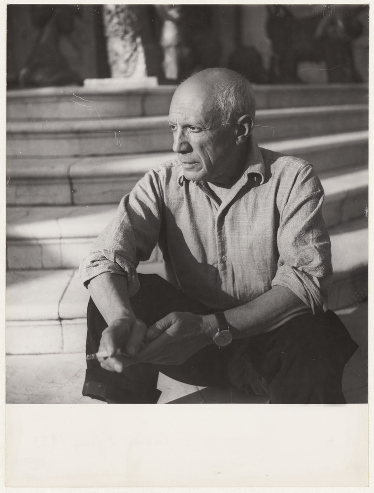 Pablo Picasso sur les marches du perron de La Californie, Cannes, le 2 juin 1955