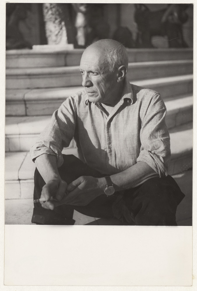 Pablo Picasso sur les marches du perron de La Californie, Cannes, le 2 juin 1955