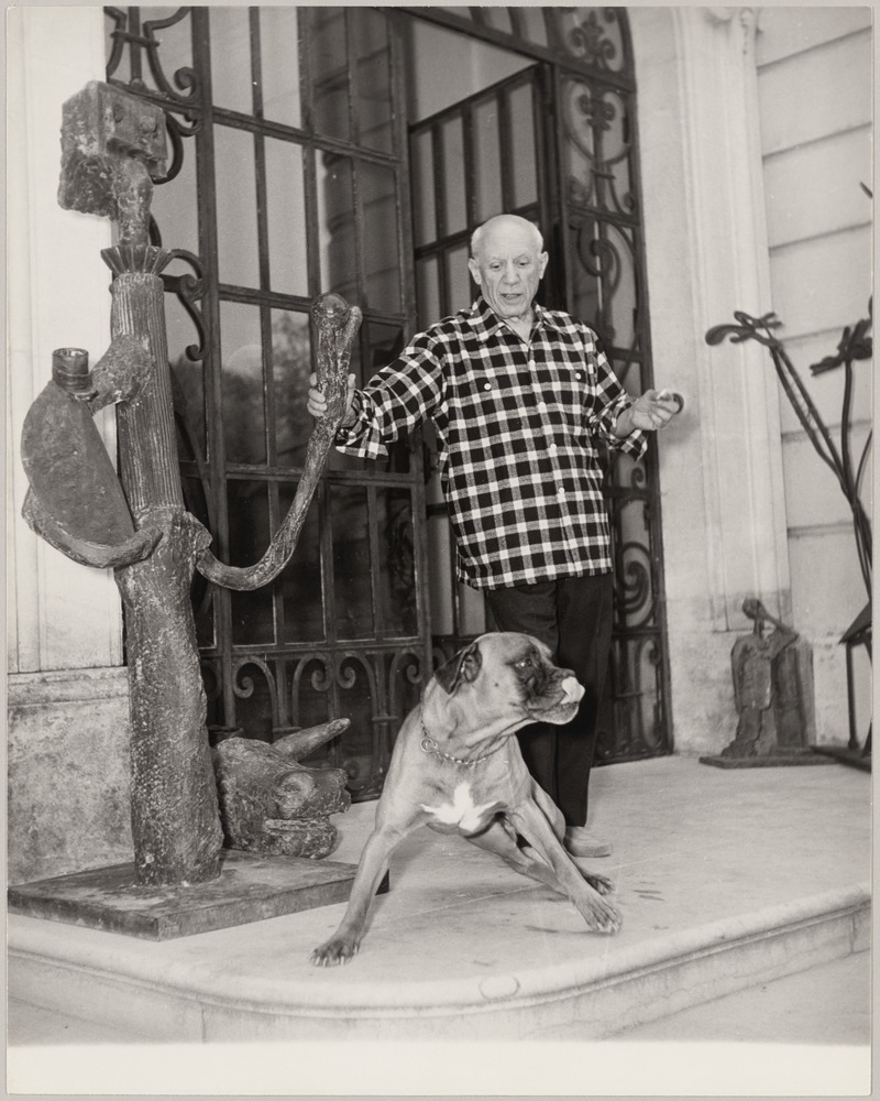Pablo Picasso tenant "La Femme à l'orange", à ses pieds "Tête de taureau" et son chien Yan à l'entrée de la Villa La Californie, Cannes, en 1960-61