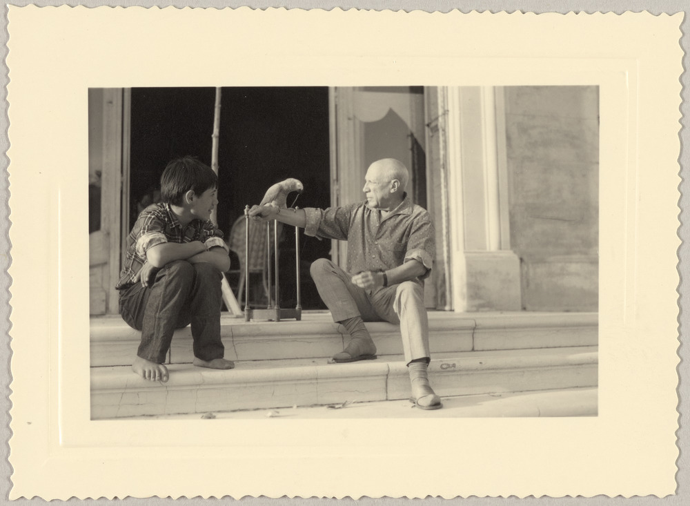 Pablo Picasso tenant un perroquet sur son avant-bras avec son fils Claude sur les marches du perron de La Californie, Cannes, en [1960]