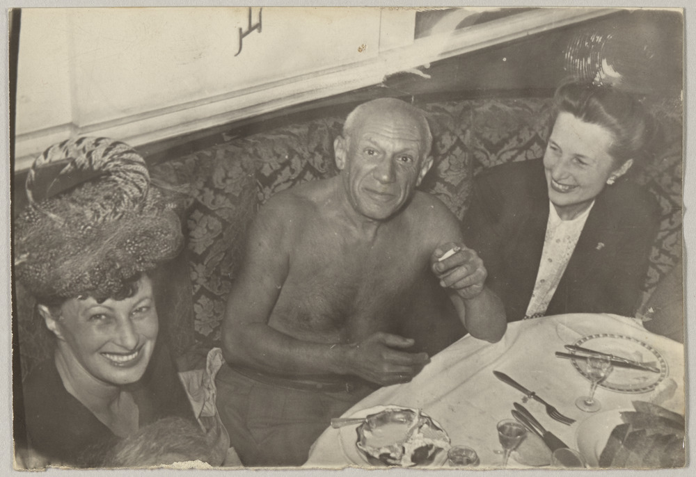 Pablo Picasso torse nu entouré de Janine Quiquandon Crémieux et d'une femme non identifiée dans un restaurant lors du Congrès des Intellectuels pour la Paix à Wroclaw, en août 1948