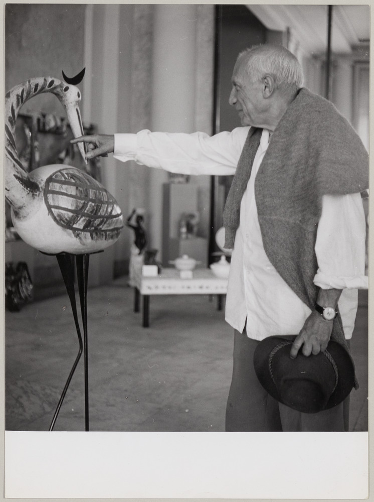 Pablo Picasso touchant le bec d'un héron en terre cuite dans une exposition sur…