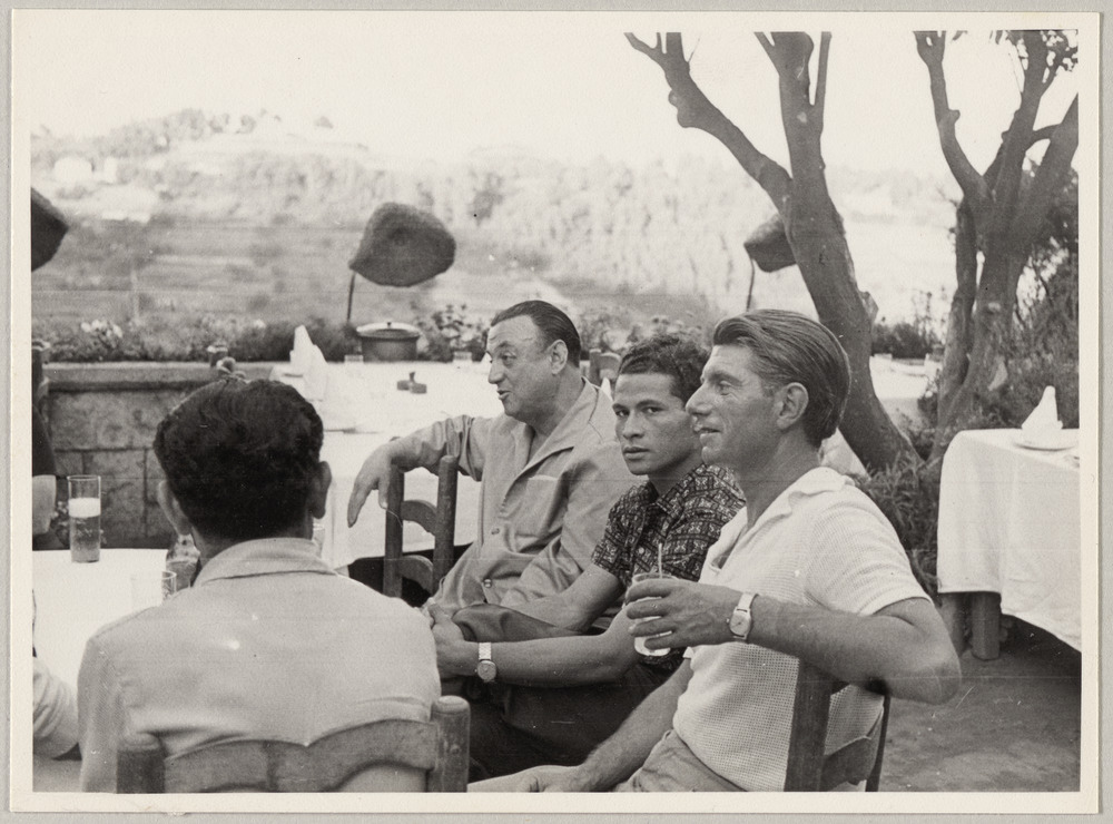 Paco Munoz, Curro Girón, Paul Picasso et le Mozo de espadas des frères Girón de dos attablés à la Colombe d'or, Saint-Paul-de-Vence, en 1960