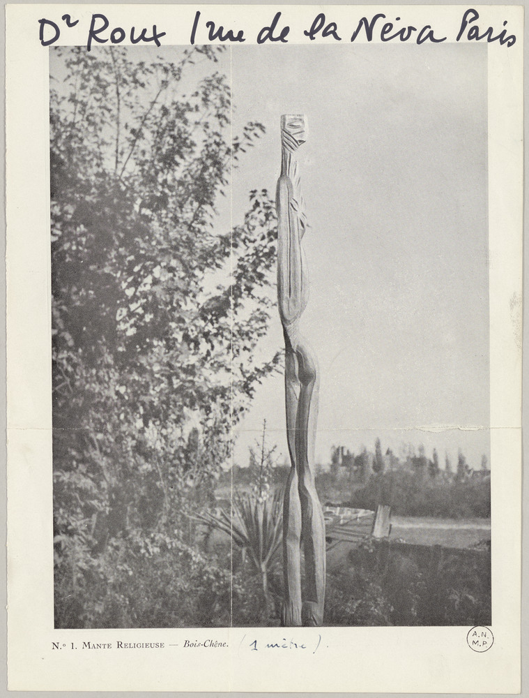 Copié dans le presse-papier :Page de catalogue présentant au recto une sculpture : "N° 1. Mante religieuse… - s.d. - https://cep.museepicassoparis.fr/explorer/page-de-catalogue-presentant-au-recto-une-sculpture-ndeg-1-mante-religieuse-apph13489