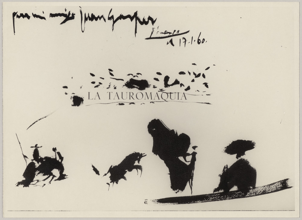 [Page de titre] de "La tauromaquia" avec dessin à l'encre de Chine d'une scène de corrida, 17 janvier 1960