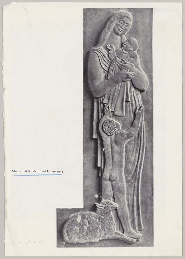Page d'un catalogue avec le dessin d'un buste de femme et au dos, le bas-relief "Mutter mit Kindern und Lamm" de l'Hôtel de ville de Neu-Ulm par Edwin Scharff