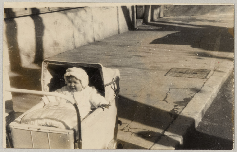 Paloma Picasso dans son landau, dans les rues de Vallauris, en 1949