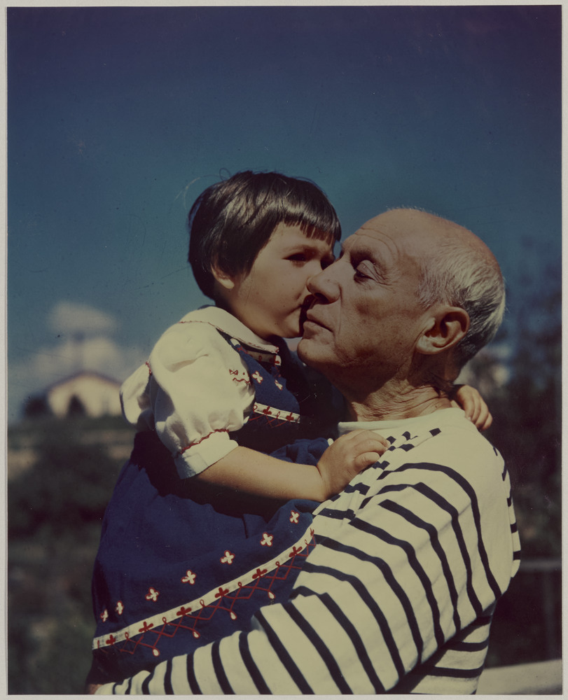 Paloma Picasso embrassant son père, Pablo Picasso, dans le jardin de La Galloise, Vallauris, vers 1951