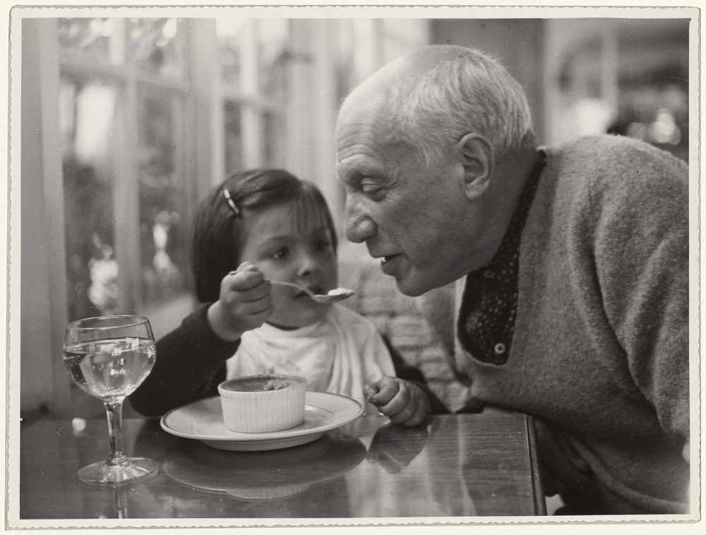 Paloma Picasso faisant goûter de la crème au caramel à son père, Pablo Picasso,…