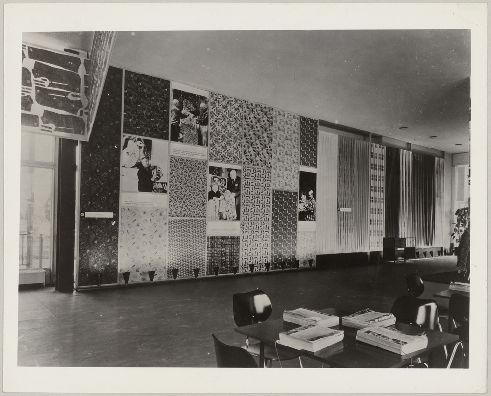 Panneau exposant des photographies et des tissus de Chagall, Picasso, Léger et Joan Miró, lors de l'exposition "Artists in Fabrics" du Brooklyn Museum, en 1955 - 1956
