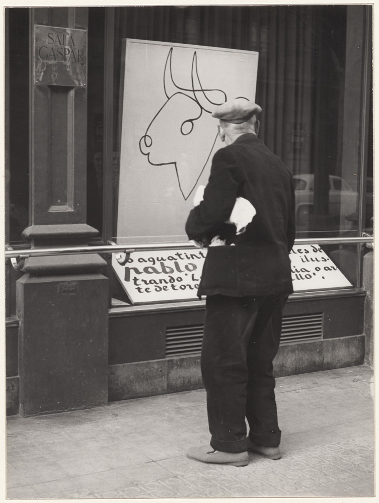 Passant devant la devanture de l'exposition "Aquatintas originales de Pablo Picasso illustrando "La tauromaquia o arte de torear de Pepe Illo", Sala Gaspar de Barcelone, le 11 janvier 1960