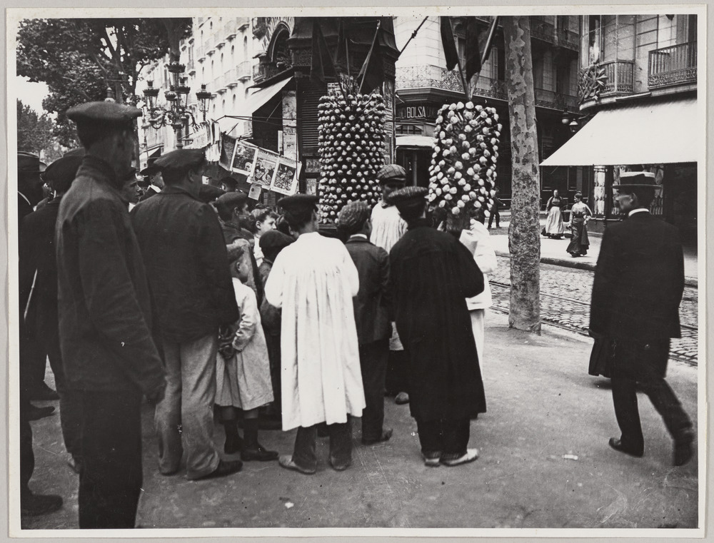 Passants assemblés autour de vendeurs ambulants, La Rambla de Canaletes, Barcelone, en 1907-08
