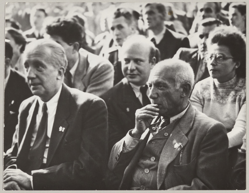 Paul Eluard et Pablo Picasso avec Francis Crémieux, Victor Leduc et Claire Nicolas au Congrès des Intellectuels pour la Paix à Wroclaw, en août 1948