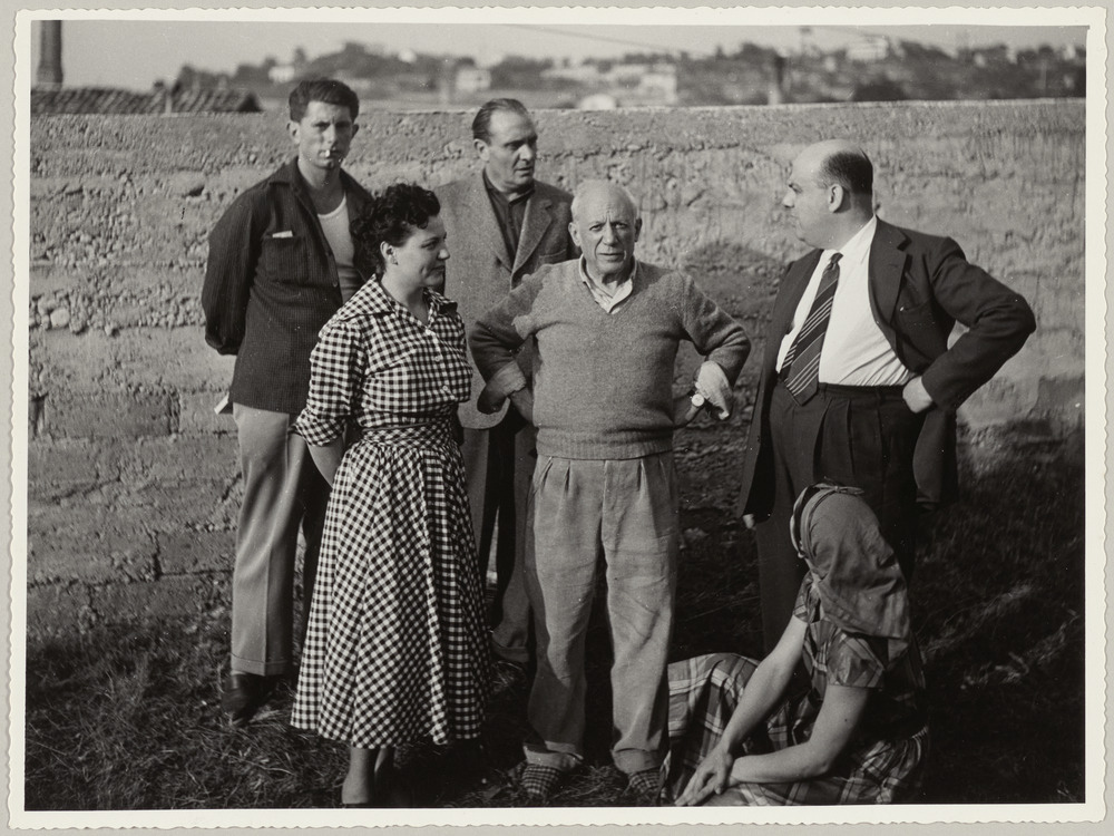 Paul et Pablo Picasso avec trois amis et Françoise Gilot, de dos, assise au sol, à l'atelier du Fournas, Vallauris