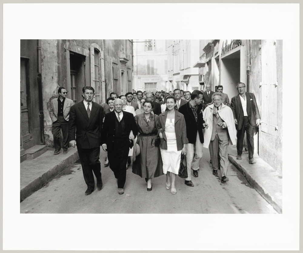Paul et Pablo Picasso, Jacqueline Roque, Christine Picasso, John Richardson, Jean Cocteau, Douglas Cooper suivi de Michel Leiris en route pour la Corrida, dans les rues d'Arles, en 1957