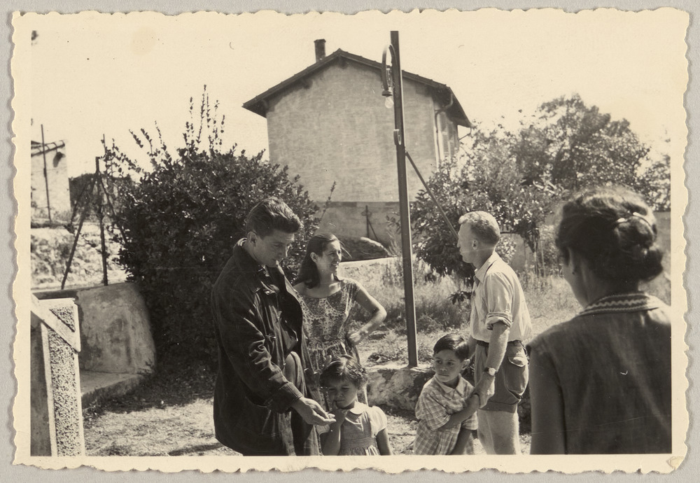 Paul et Paloma Picasso, Françoise Gilot discutant avec Claude Roy, et Claude Picasso et Rosita Hugué de dos à La Galloise, Vallauris, en [1952]