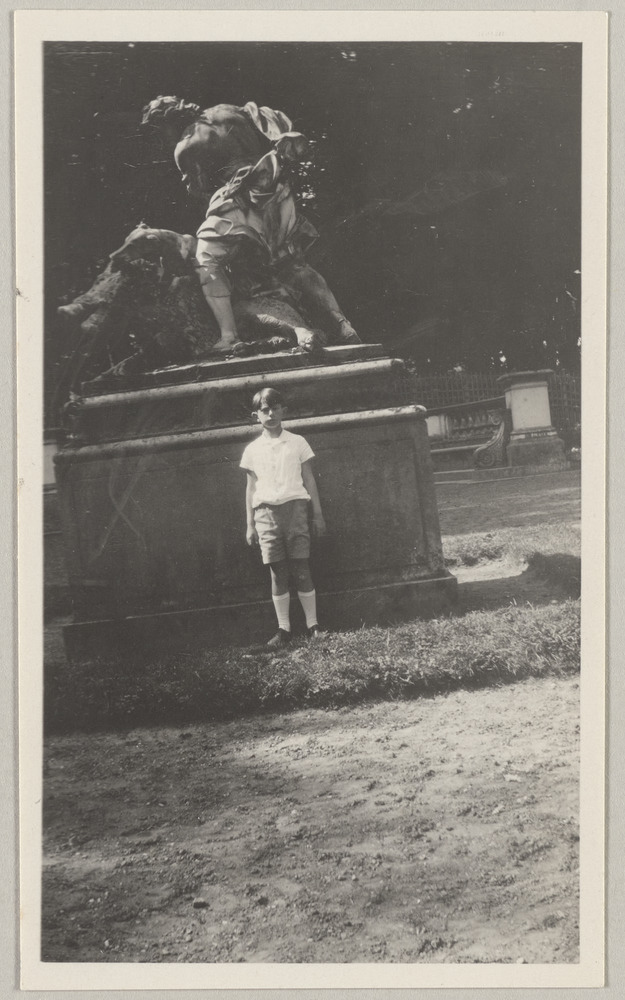 Paul Picasso devant la sculpture de Méléagre chassant un sanglier dans le bosquet de l'arc de triomphe, au parc du château de Versailles, en [1930-31]