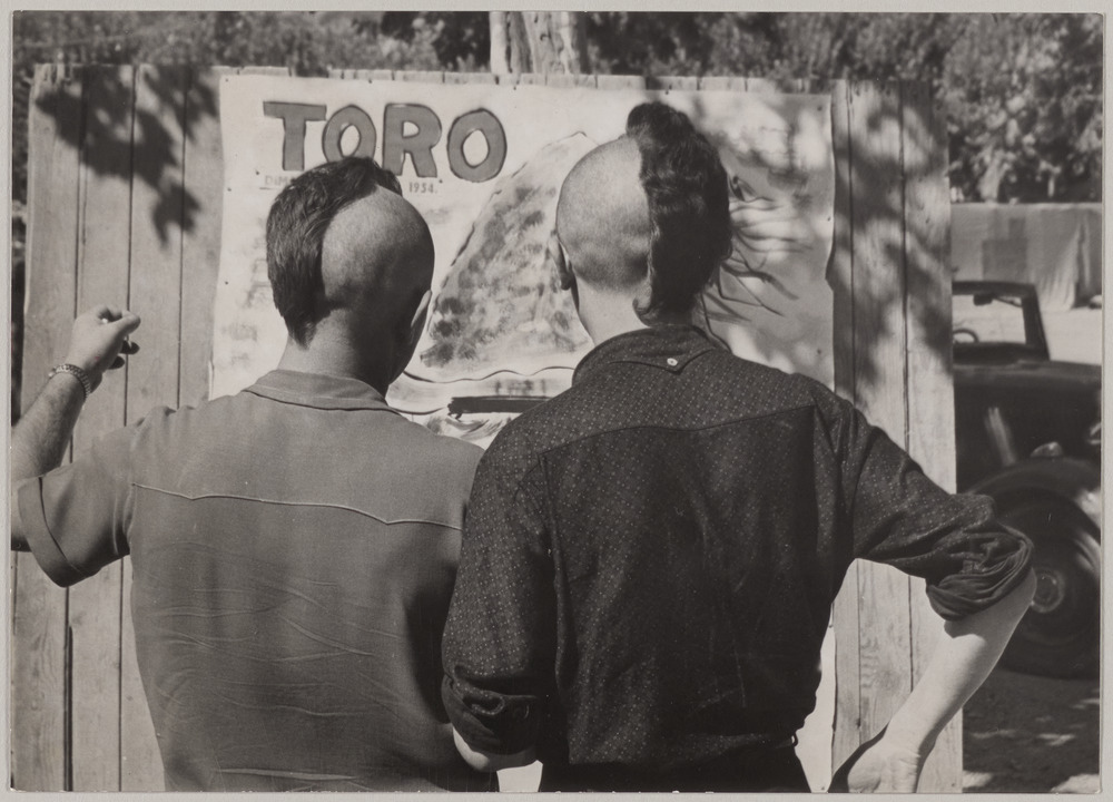 Paul Picasso et Pierre Baudouin coiffés d'une coupe à l'iroquois devant l'affiche "Toro", Vallauris, le 30 juillet 1954