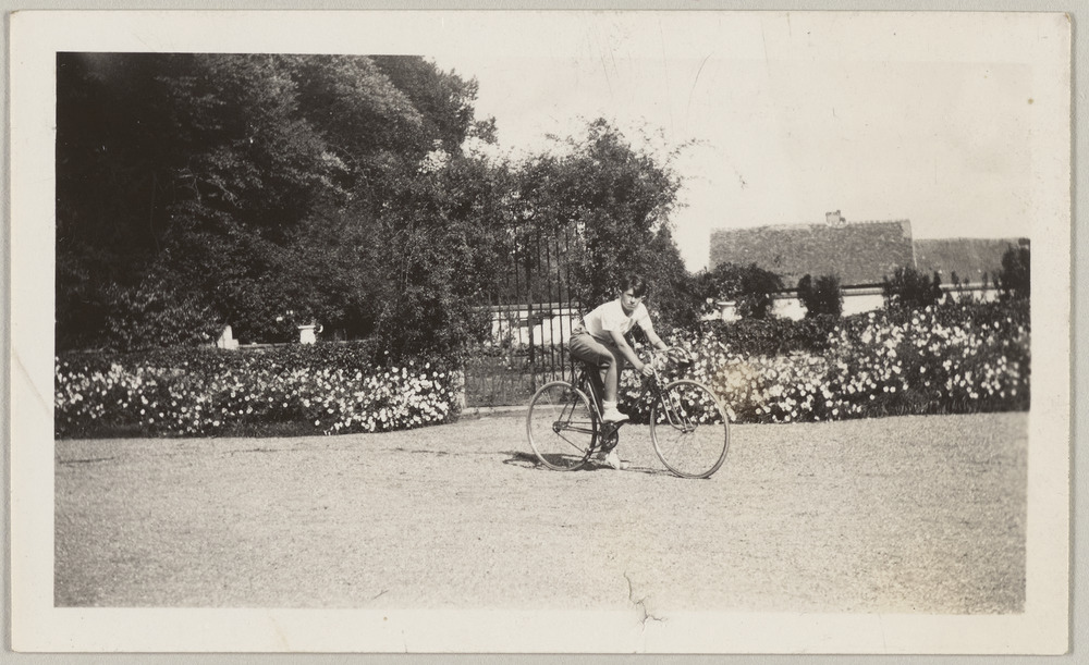 Paul Picasso sur une bicyclette dans le parc de Boisgeloup, Gisors, dans les années 1930