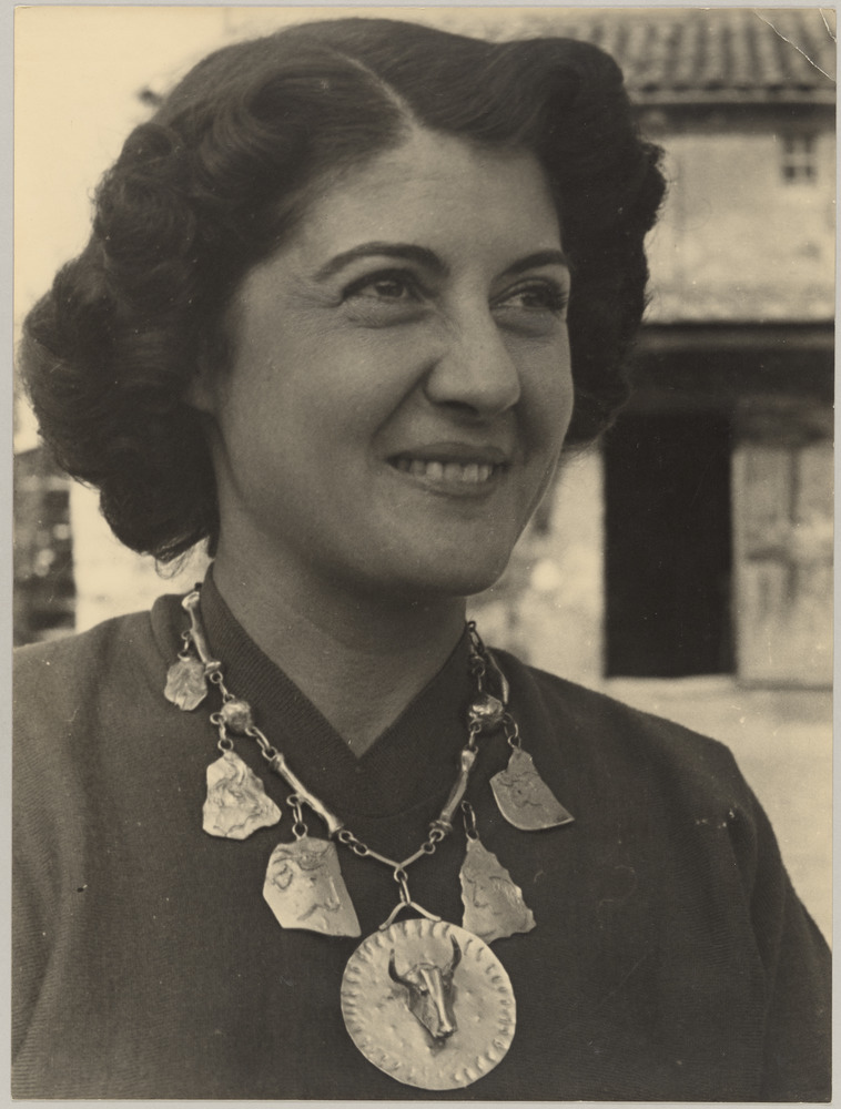 Paule de Lazerme porte un collier à tête de taureau réalisé par Picasso et offert en mars 1954