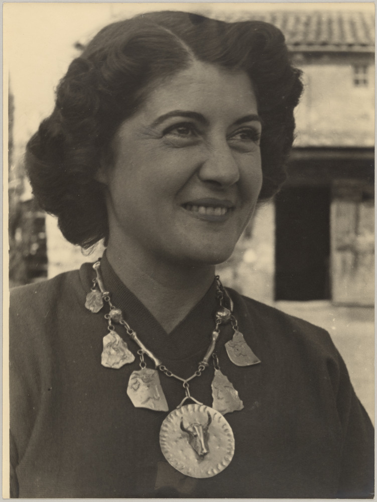 Paule de Lazerme porte un collier à tête de taureau réalisé par Picasso et offert en mars 1954