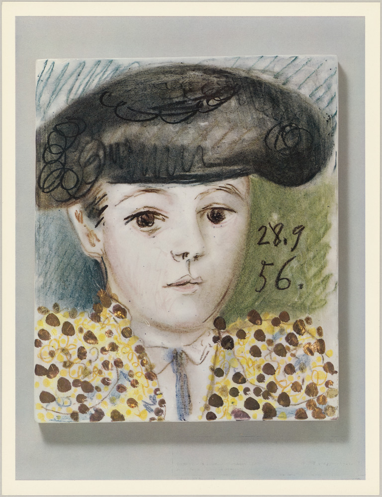 Peinture sur carreau de céramique "Claude Picasso à 9 ans en costume de toréador" datée du 28 septembre 1956