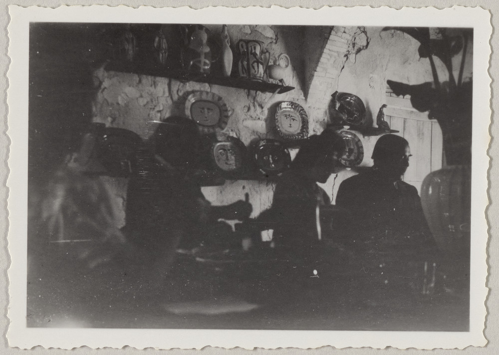 Personnes attablées dans le clair-obscur de l'atelier de Madoura, Vallauris