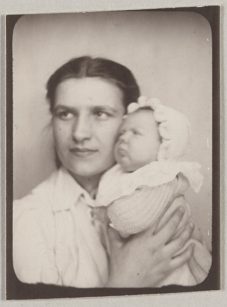 Photographies d'identité d'une femme avec un bébé et d'un petit enfant [famille de Françoise Gilot] et étui photomaton