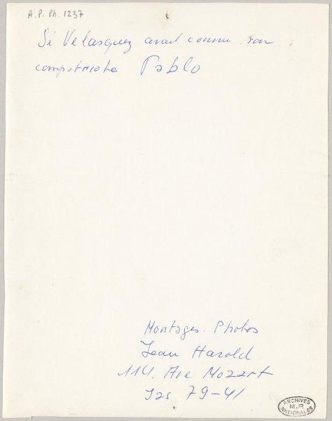 Annotation manuscrite de l'auteur au dos, en haut à gauche : "Si Velasquez avait connu son compatriote Pablo"