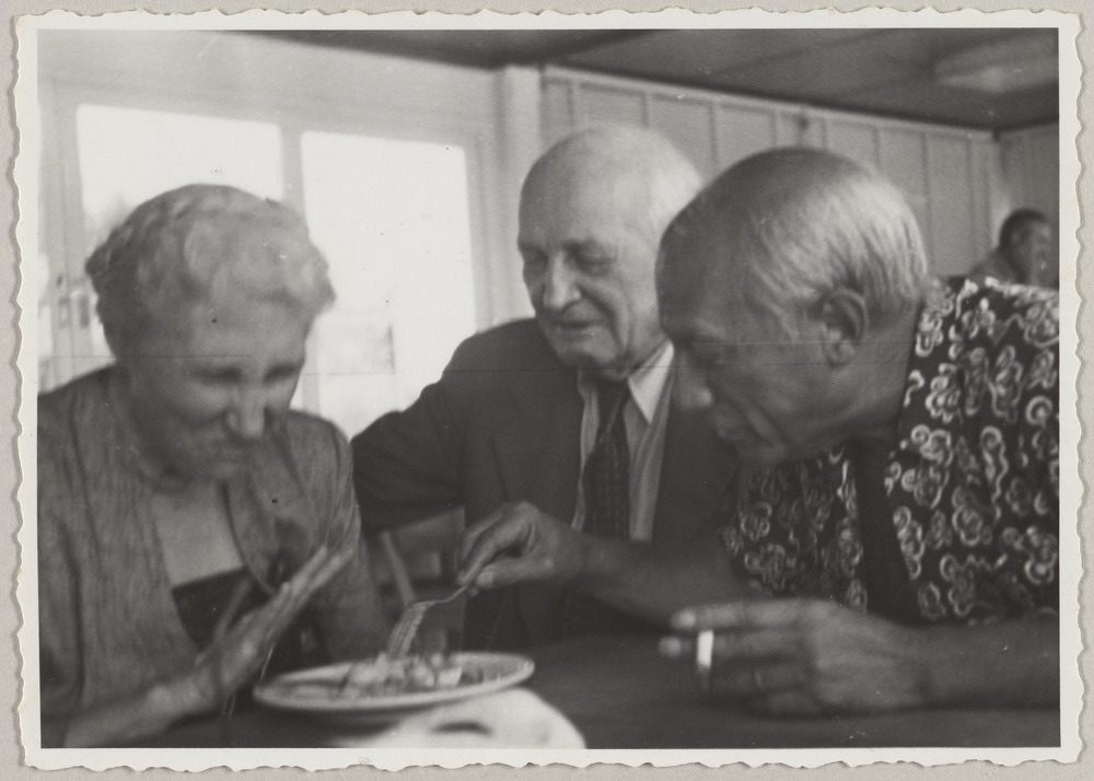 Picasso avec des amis au restaurant [Nounou, Plage de Golfe-Juan]