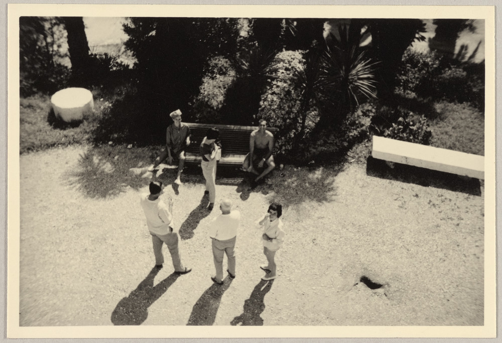 Picasso, Catherine Hutin, deux femmes, deux hommes dans le jardin, vue depuis le 1er étage de La Californie, Cannes