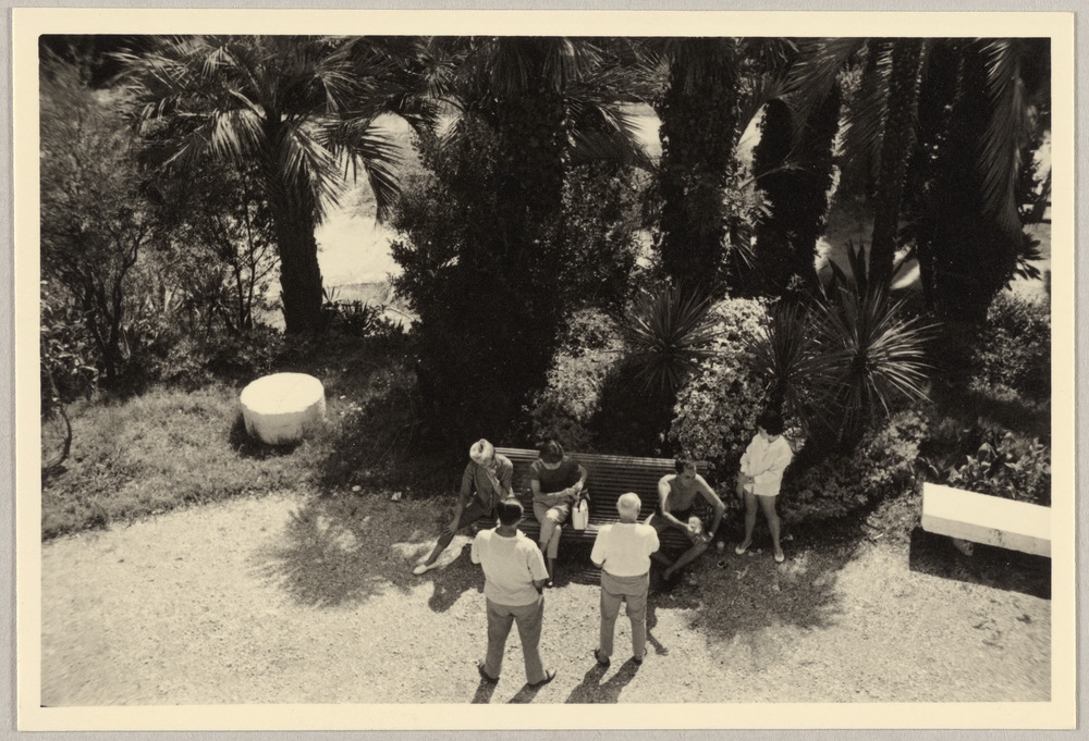 Picasso, Catherine Hutin, deux femmes et deux hommes dans le jardin, vue depuis le 1er étage de La Californie, Cannes