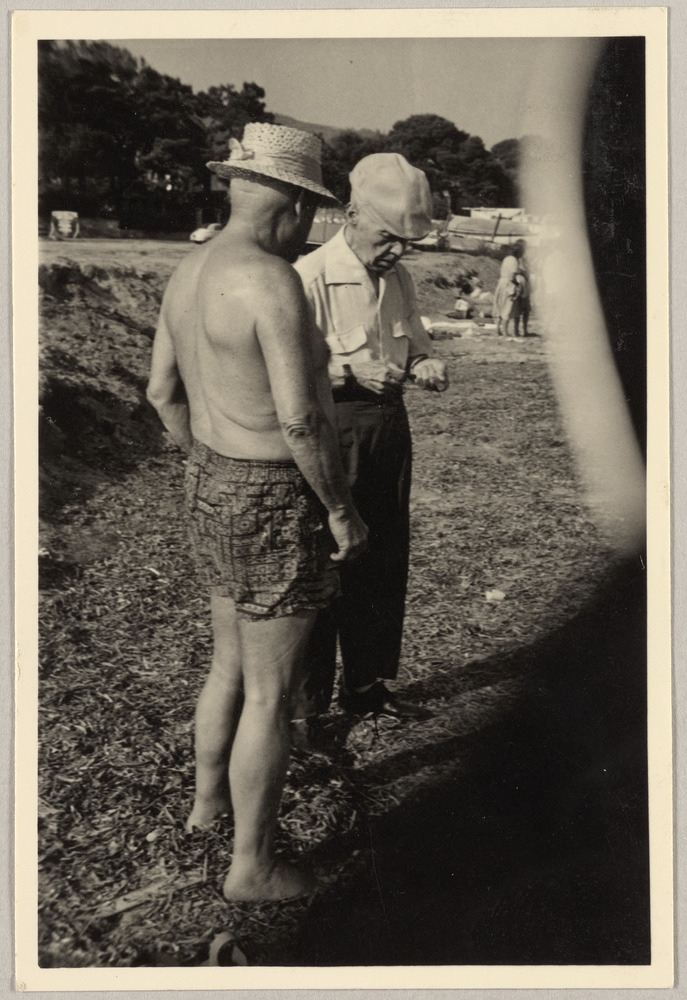 Picasso en caleçon et chapeau de paille avec Manuel Pallarès à la plage, dans les années [1950-60]