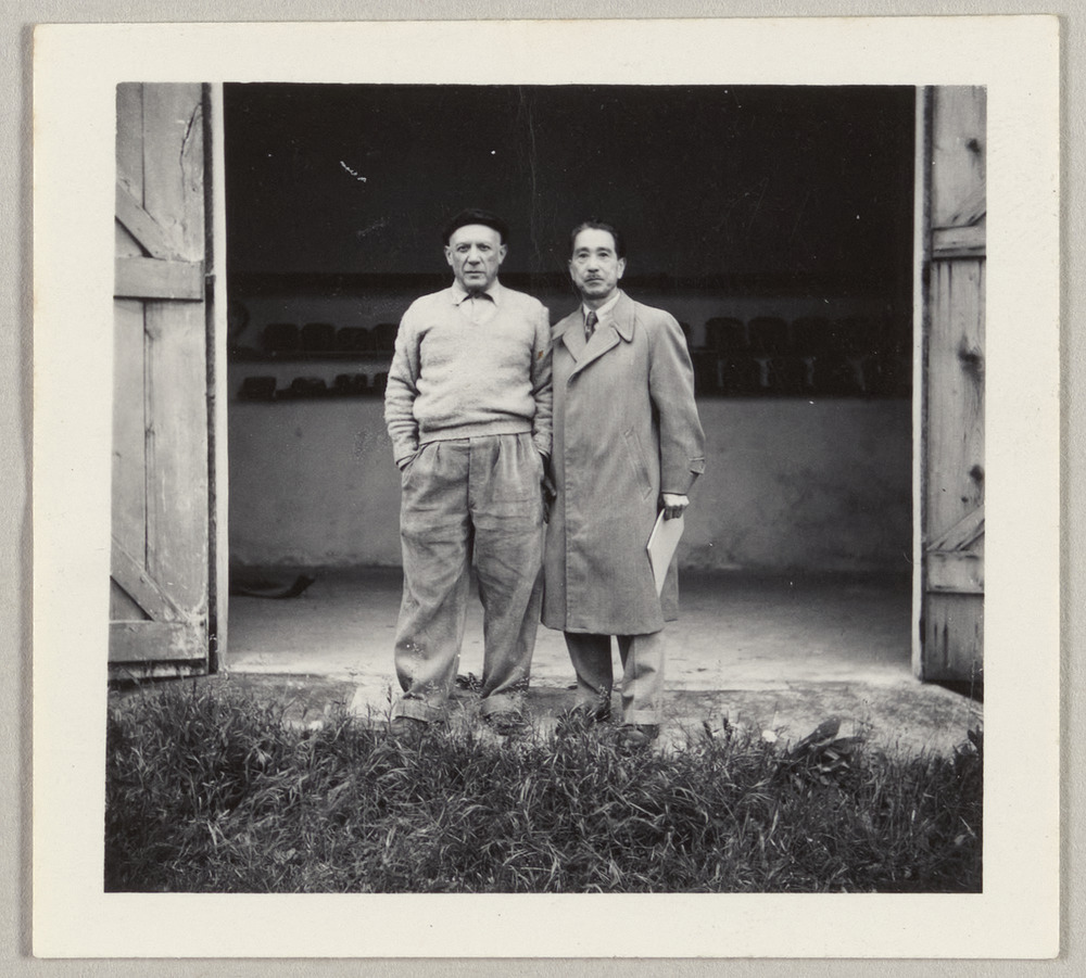 Picasso et Rüchiro Kawashima devant l'entrée de l'atelier du Fournas, Vallauris