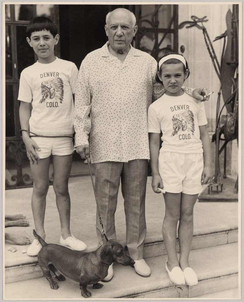 Picasso et ses enfants, Claude et Paloma, avec Lump le teckel sur le perron de…