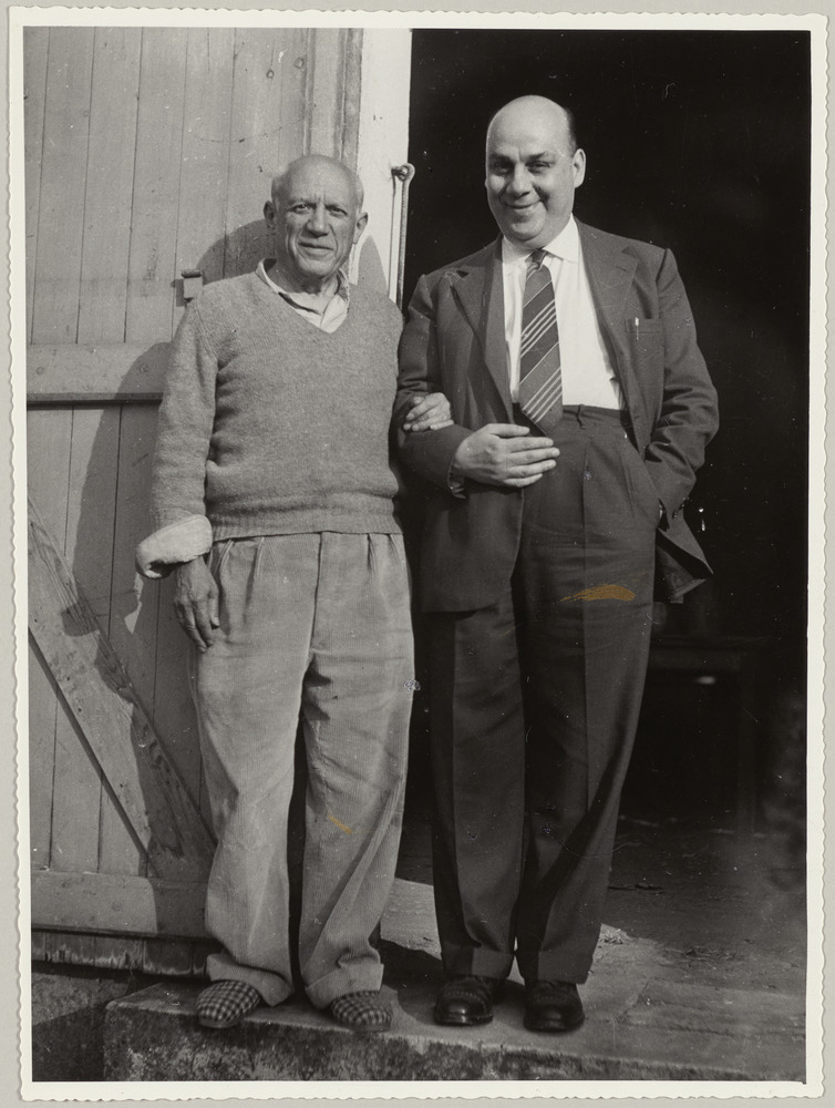 Picasso et un homme sur le seuil de l'atelier du Fournas