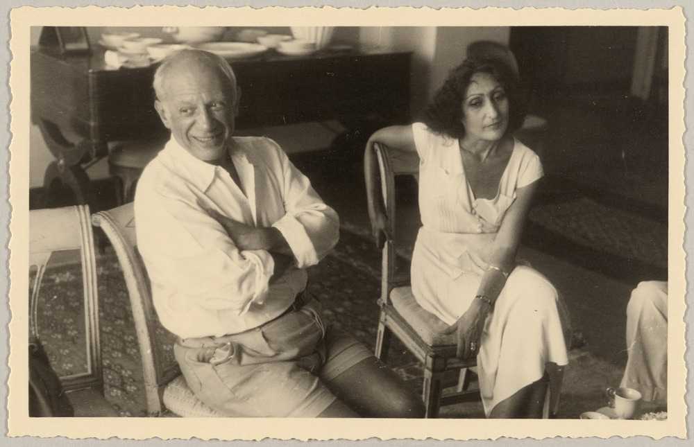 Picasso et une amie dans le salon des Batigne, Vallauris, circa 1950