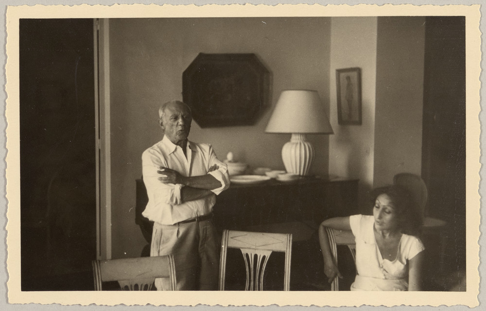 Picasso et une amie dans le salon des Batigne, Vallauris, circa 1950