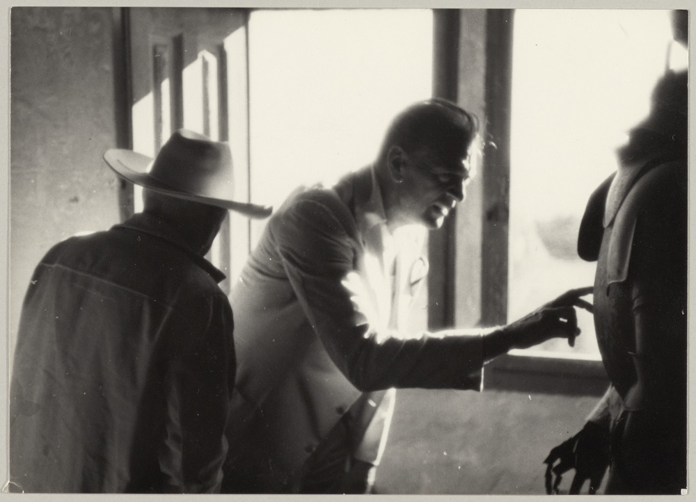 Picasso regardant par la fenêtre et Gary Cooper examinant une armure de la nouvelle propriété de David Douglas Duncan, à Castellaras-le-Vieux, Mouans-Sartoux, en 1960