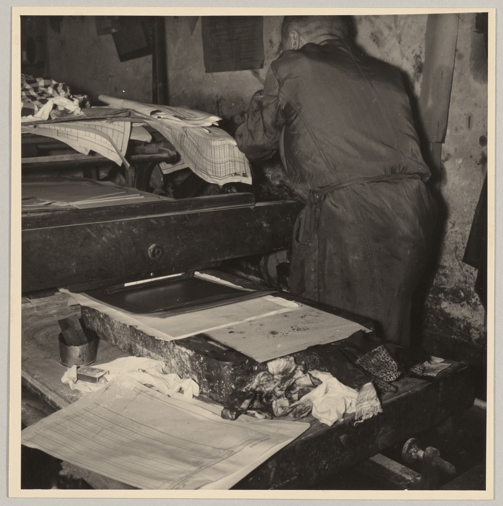 Pierre-André Benoît de dos travaillant sur "La rose et le chien : poème perpétuel" dans son atelier à Alès, en 1958