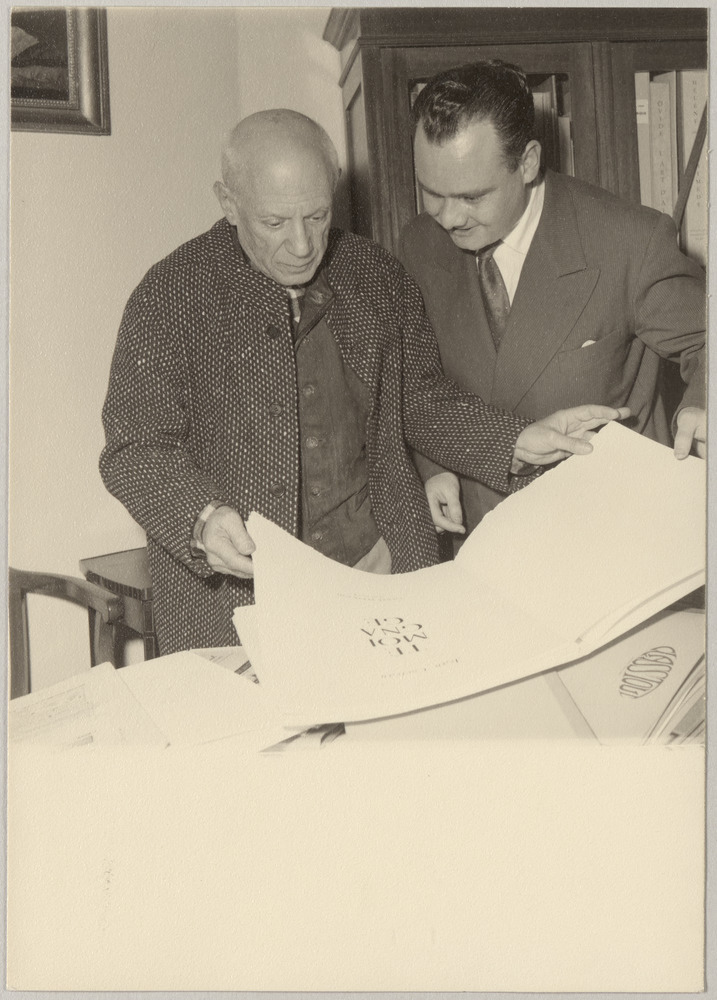 Pierre Bertrand et Pablo Picasso feuilletant le livre illustré "Témoignage" de…