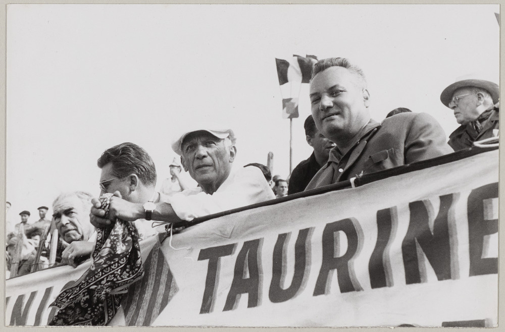 Pierre Brune, Georges Bonnes, Pablo Picasso et le maire de Céret, Henri Guitard à la corrida de Céret, le 20 septembre 1953