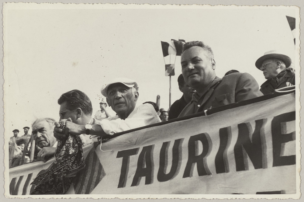 Pierre Brune, Georges Bonnes, Pablo Picasso et le maire de Céret, Henri Guitard à la corrida de Céret, le 20 septembre 1953