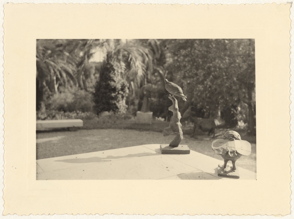 Présentes sur la photographie les oeuvres : "Baigneuse" (MP305), derrière la Baigneuse vers la droite "La chouette en colère" et en arrière-plan, se trouvent dans le jardin "La chèvre" (MP340) et "Tête de femme" (MP302)