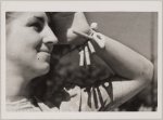 Plan rapproché de Françoise Gilot regardant au loin sur la plage de Golfe-Juan, fin des années 1940