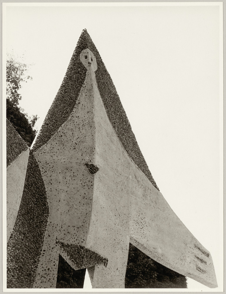 Plan rapproché de la partie supérieure de la sculpture en bétogravure "Femme aux bras écartés", prieuré St-Hilaire, Chalo-Saint-Mars, en 1962